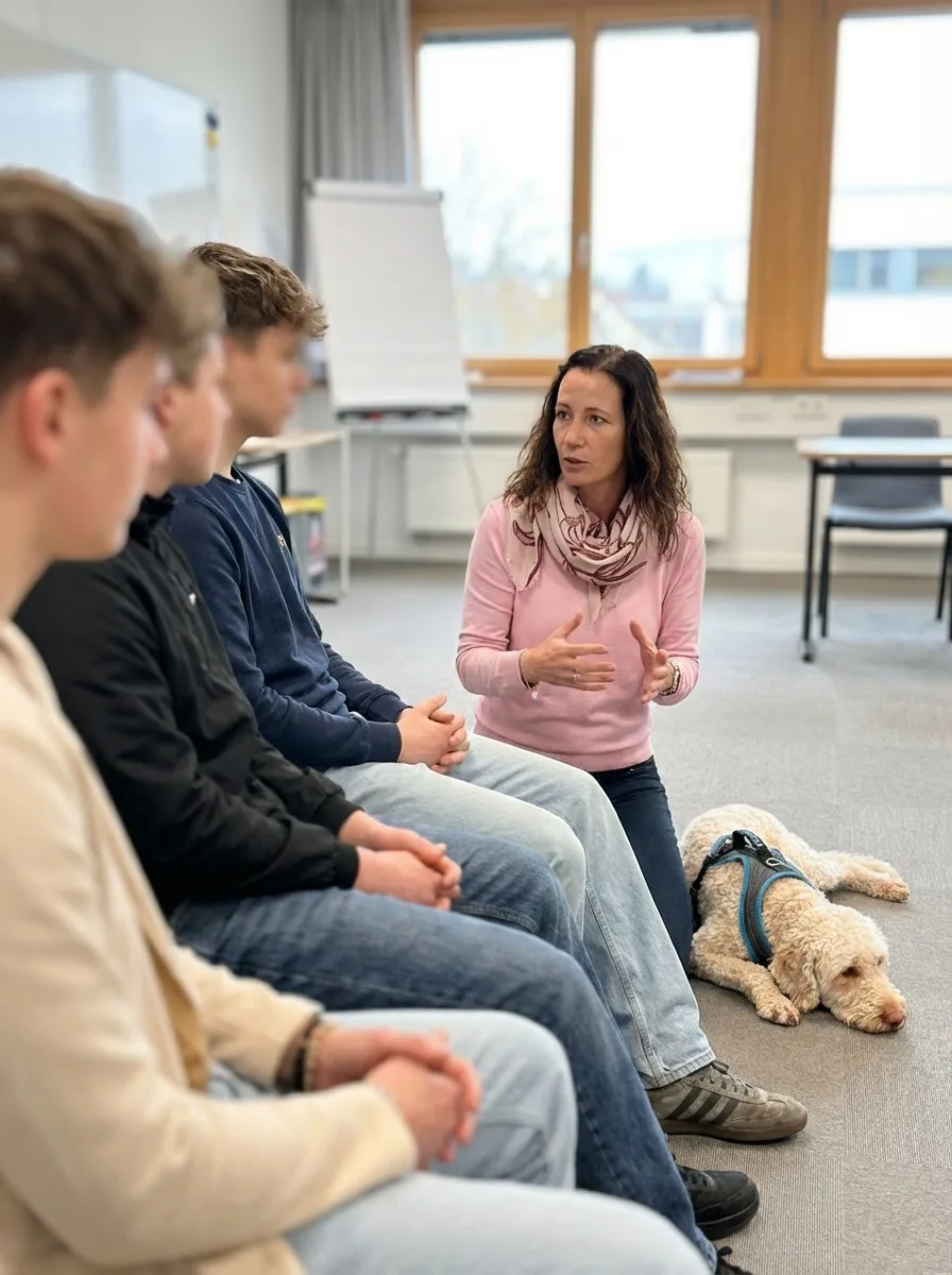 Du gehst aus diesem Seminartag mit konkreten Formulierungen, die erklären, was der Hund im Unterricht leistet, ohne dass du dich rechtfertigen oder ihn zum Vorführobjekt machen musst. Der Schulleiter fragt nach. Du antwortest ruhig, klar und fachlich, und spürst dabei, wie sich der Kloss im Hals zum ersten Mal auflöst.